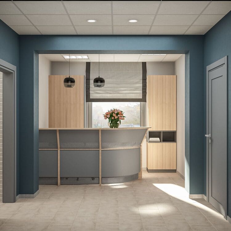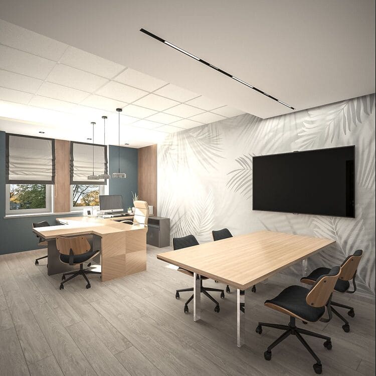 - Выполнили пол из качественного и долговечного кварц-винила, поклеели современный флизилин и покрасили его, установили подвесные потолки и встроенные светильники, зонировали помещения для работы, санузлы и общие зоны, кухню, переговорную.